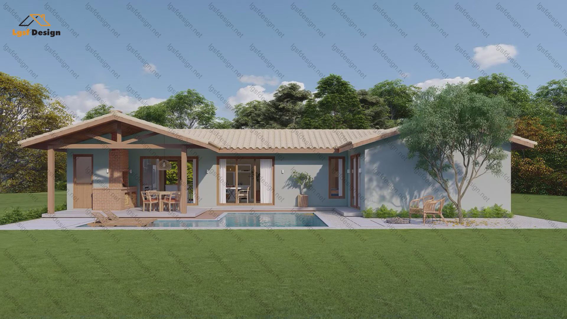 Adding to the allure, a refreshing swimming pool graces the front courtyard, elevating the outdoor experience. The large windows serve as a prominent feature, seamlessly blending the indoor and outdoor spaces while allowing residents to bask in the beauty of the exterior.